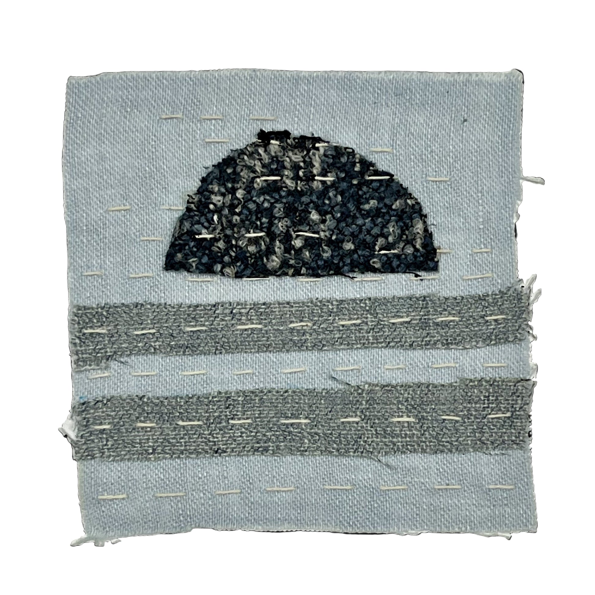 A speckled navy half-moon rises above layered bands of textured gray, set against a soft sky-blue ground. The sashiko stitches create subtle movement, echoing rippling water and lending depth to the composition. Each piece is made from natural linen and cotton fabrics, chosen for their durability, softness, and sustainable origins.